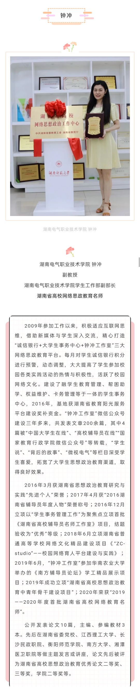 钟冲:湖南电气职业技术学院学生工作部副部长、副教授、第一批“湖南省高校网络教育名师培育支持计划”入选者