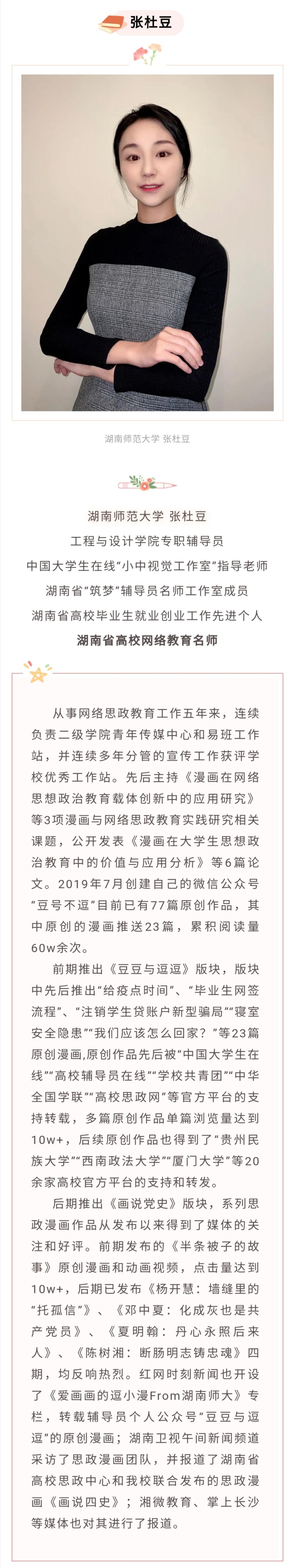 张杜豆:湖南师范大学工程与设计学院专职辅导员、中国大学生在线“小中视觉工作室”指导老师、第二批“湖南省高校网络教育名师培育支持计划”入选者