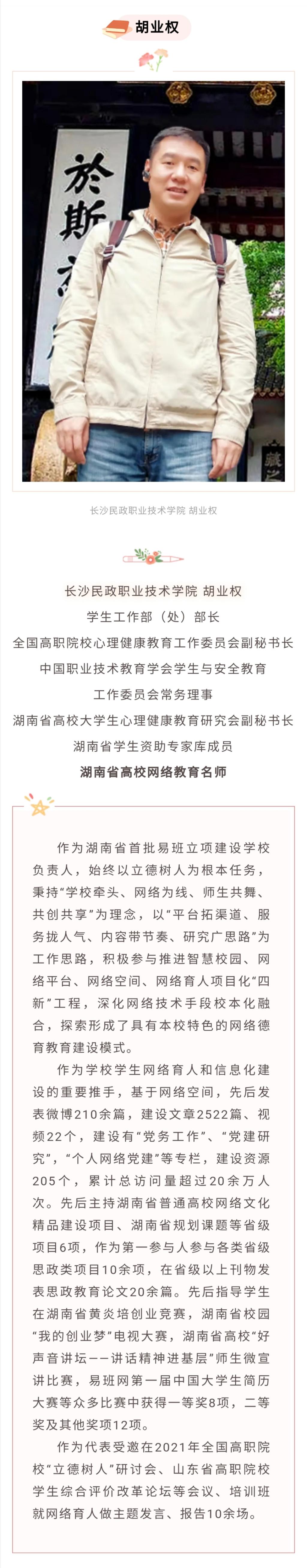 胡业权:长沙民政职业技术学院学生工作部(处)部长、全国高职院校心理健康教育工作委员会副秘书长、第二批“湖南省高校网络教育名师培育支持计划”入选者