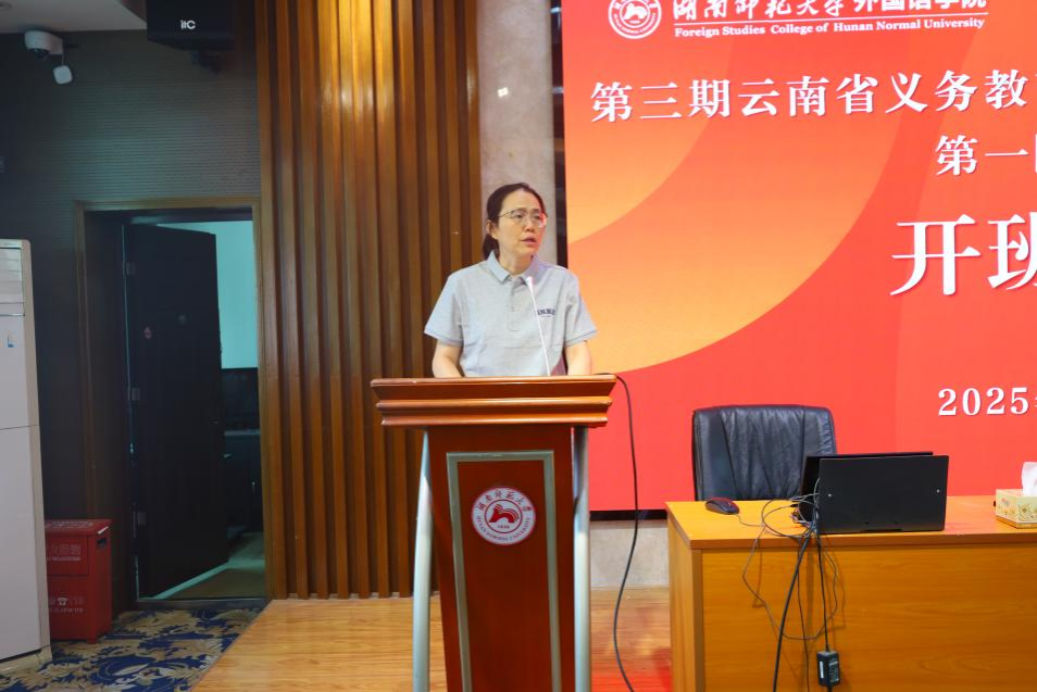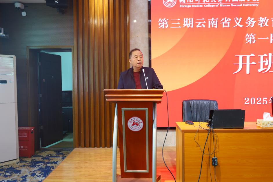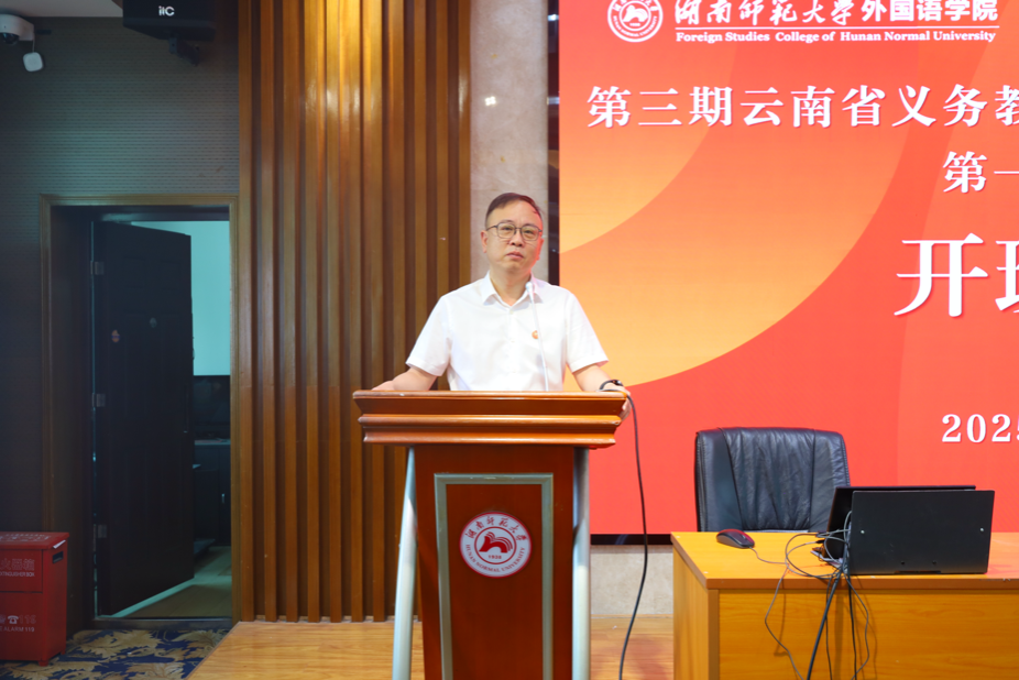开班典礼上,湖南师范大学外国语学院副院长司徒皓代表学校对云南省教育厅的支持表示衷心感谢,并向参训教师致以诚挚问候。他介绍了湖南师范大学及外国语学院的深厚历史与卓越成就。他鼓励各位学员珍惜学习机会,积极思考、主动实践,将先进教学理念融入课堂,为云南小学英语教育注入新活力。