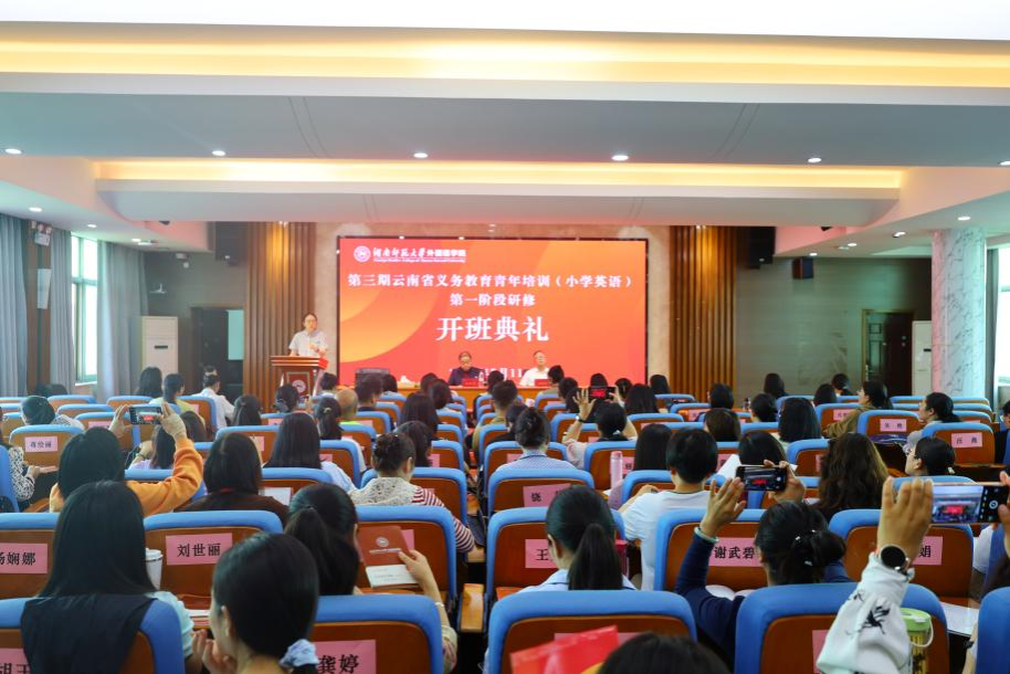 (通讯员 陶瑜)5月11日上午,云南省义务教育青年培训(小学英语)第一阶段研修在我院515报告厅隆重开班。湖南师范大学“国培计划”项目办副主任朱常青、湖南师范大学外国语学院副院长司徒皓出席开班典礼,外国语学院培训中心主任宋静主持活动。