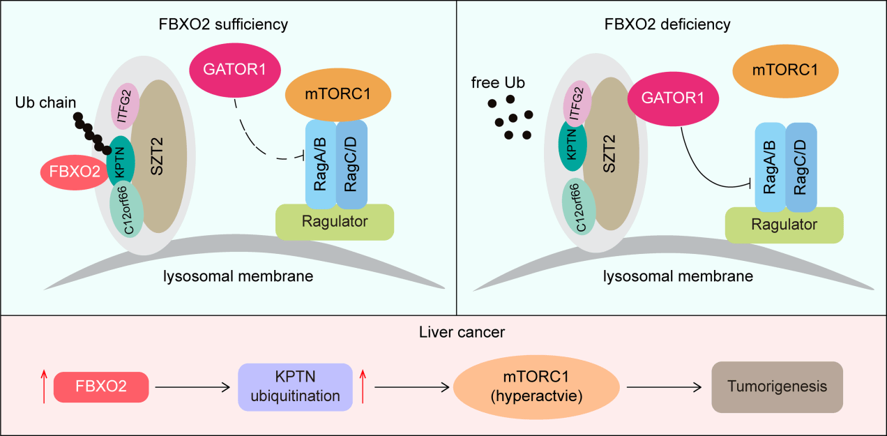 该研究发现,FBXO2促进氨基酸诱导的mTORC1活化。进一步的分子机制研究发现,FBXO2通过其F-box相关结构域与KPTN直接相互作用,促进其在第49、67、262和265位赖氨酸残基发生K48-和K63-连接类型的多聚泛素化。FBXO2介导的KPTN泛素化抑制KPTN与ITFG2和SZT2的相互作用,而增强KPTN与C12ORF66的相互作用,从而使KICSTOR丧失招募GATOR1复合物的功能。同时,FBXO2在肝癌组织中的蛋白水平显著高于其配对的非癌肝组织;体外细胞实验和体内动物实验均表明,FBXO2及其介导的KPTN泛素化可以显著促进肝癌进展。该研究阐明了FBXO2介导的KPTN泛素化调控mTORC1信号通路的分子机制,并提示FBXO2和KPTN泛素化可作为肝癌治疗的潜在靶点。