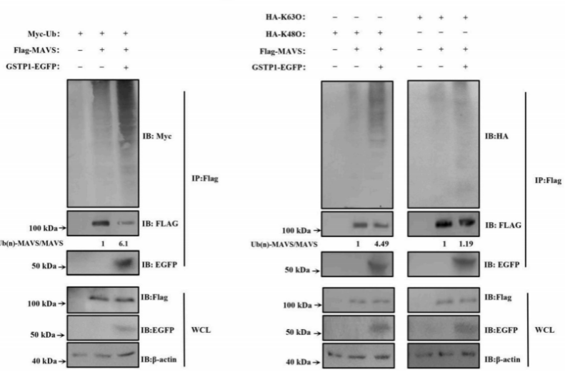 B:3nGSTP1增强3nMAVS的整体泛素化水平