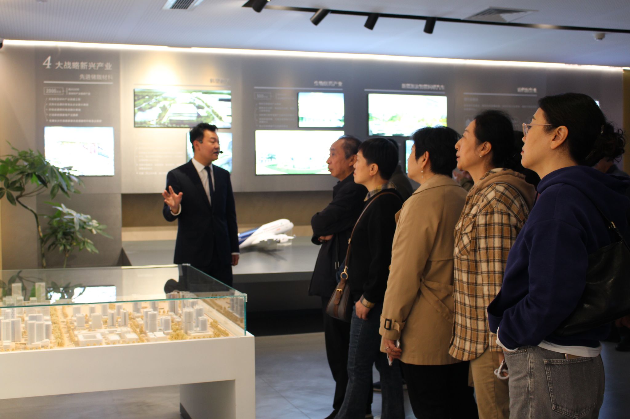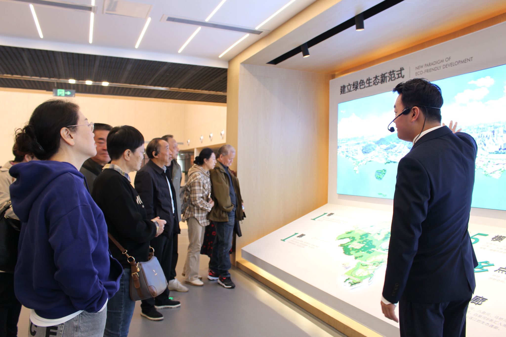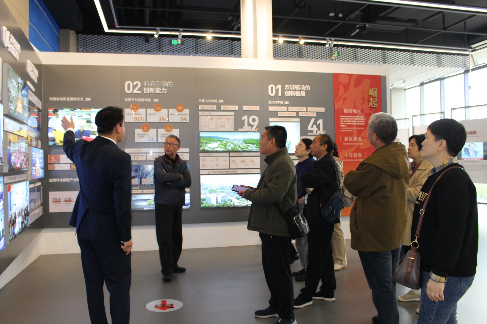 老同志们在讲解员的引导下走进这座现代化展馆。城市馆的建筑外观简约而富有现代感,内部设计则巧妙地将艺术与科技融为一体,分为建设成就展、发展规划展、“未来畅想”展三层,是展示湖南湘江新区发展蓝图的重要平台。老同志们不时驻足交流,对比今昔变迁,感慨时代进步。老同志们纷纷表示,通过此次活动见证了湘江新区砥砺奋进的辉煌成就,大家在感受发展、共享成果中提升了幸福感,更感受到了学院的关怀温暖。