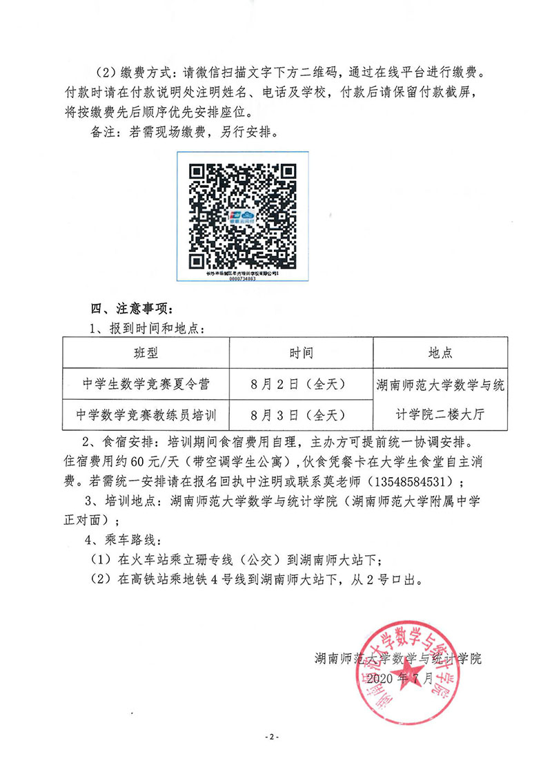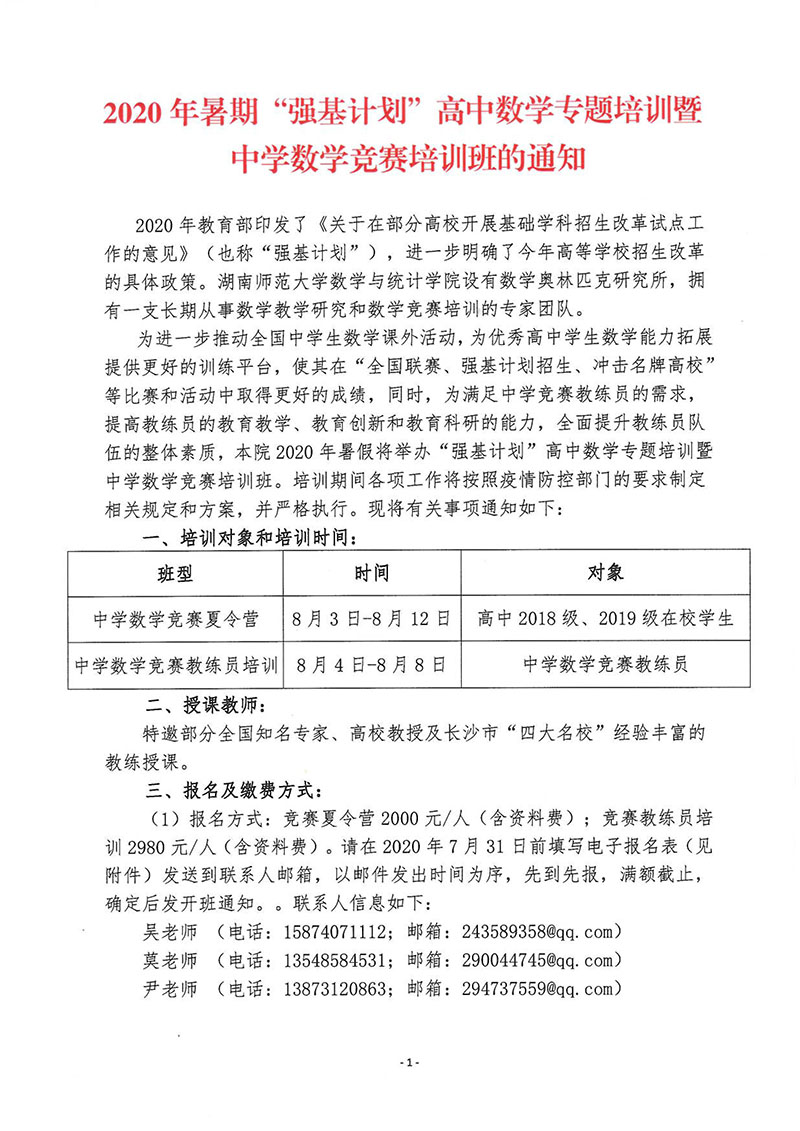 2020年暑期“强基计划”高中数学专题培训暨中学数学竞赛培训班的通知
