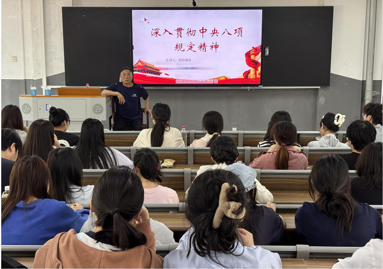 欧阳锡禹从三个方面讲授了深入贯彻中央八项规定精神专题党课,一是中央八项规定精神的背景与主要内容;二是违反中央八项规定案例剖析;三是青年党员在未来的学习、工作和生活中保持廉洁自律。他强调,中央八项规定是长期有效的铁规矩、硬杠杠,各党员同志要深刻认识新时代新征程上持续深化作风建设的重大意义,始终以"严"字当头,把落实中央八项规定精神作为捍卫"两个确立"、践行"两个维护"的实际行动。他希望,教师教育系学生党支部全体党员能够以学习贯彻中央八项规定精神为契机,加强学风建设、强化纪律意识、养成勤俭节约的作风。