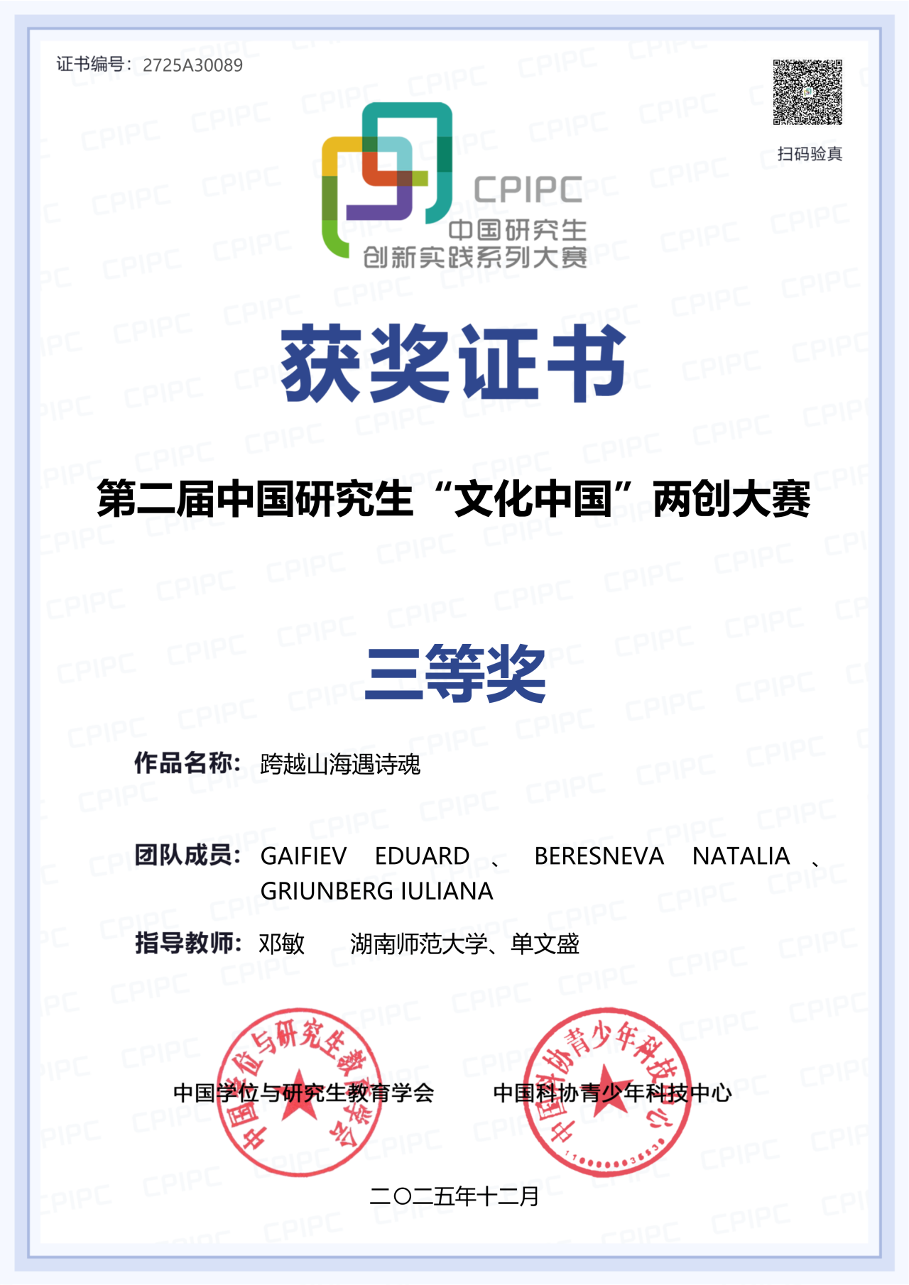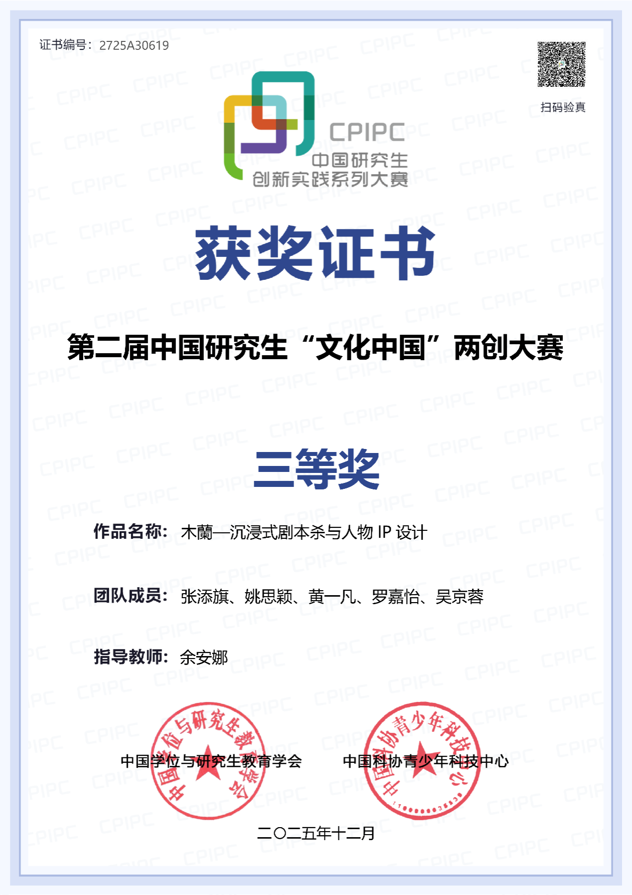 第二届中国研究生“文化中国”两创大赛在天津圆满落下帷幕,吸引全国443所高校的5398支队伍参赛,共提交作品4589件。国汉院余安娜老师指导的学生参赛作品《木兰-沉浸式剧本杀与人物IP设计》(团队成员:张添旗、姚思颖、黄一凡、罗嘉怡、吴京蓉)获中国学生组三等奖,作品以沉浸式体验为载体,让木兰“忠孝勇义”精神在趣味互动中实现当代传承。国汉院邓敏老师和新闻与传播学院单文胜老师联合指导的俄罗斯学生参赛作品《跨越山海遇诗魂》(团队成员:GAIFIEV EDUARD、BERESNEVA NATALIA、GRIUNBERG IULIANA)获留学生组三等奖,作品以屈原文化探寻为主线,串联中外诗人精神共鸣,创新中华文化国际传播视角。![]()