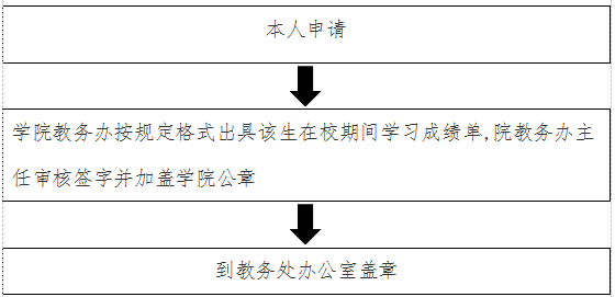 方式二:本人申请→学院教务办按规定格式出具该生在校期间学习成绩单,院教务办主任审核签字并加盖学院公章→到教务处办公室盖章。