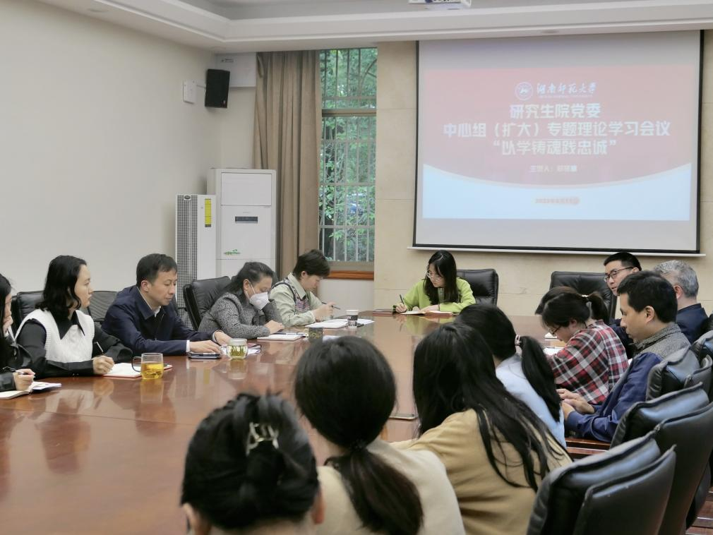 (通讯员 张韵)5月11日下午,研究生院党委理论学习中心组(扩大)在研究生院二楼会议室召开“以学铸魂践忠诚”专题学习研讨会。研究生院党委书记龚舒主持会议,研究生院全体教职工党员参加会议。